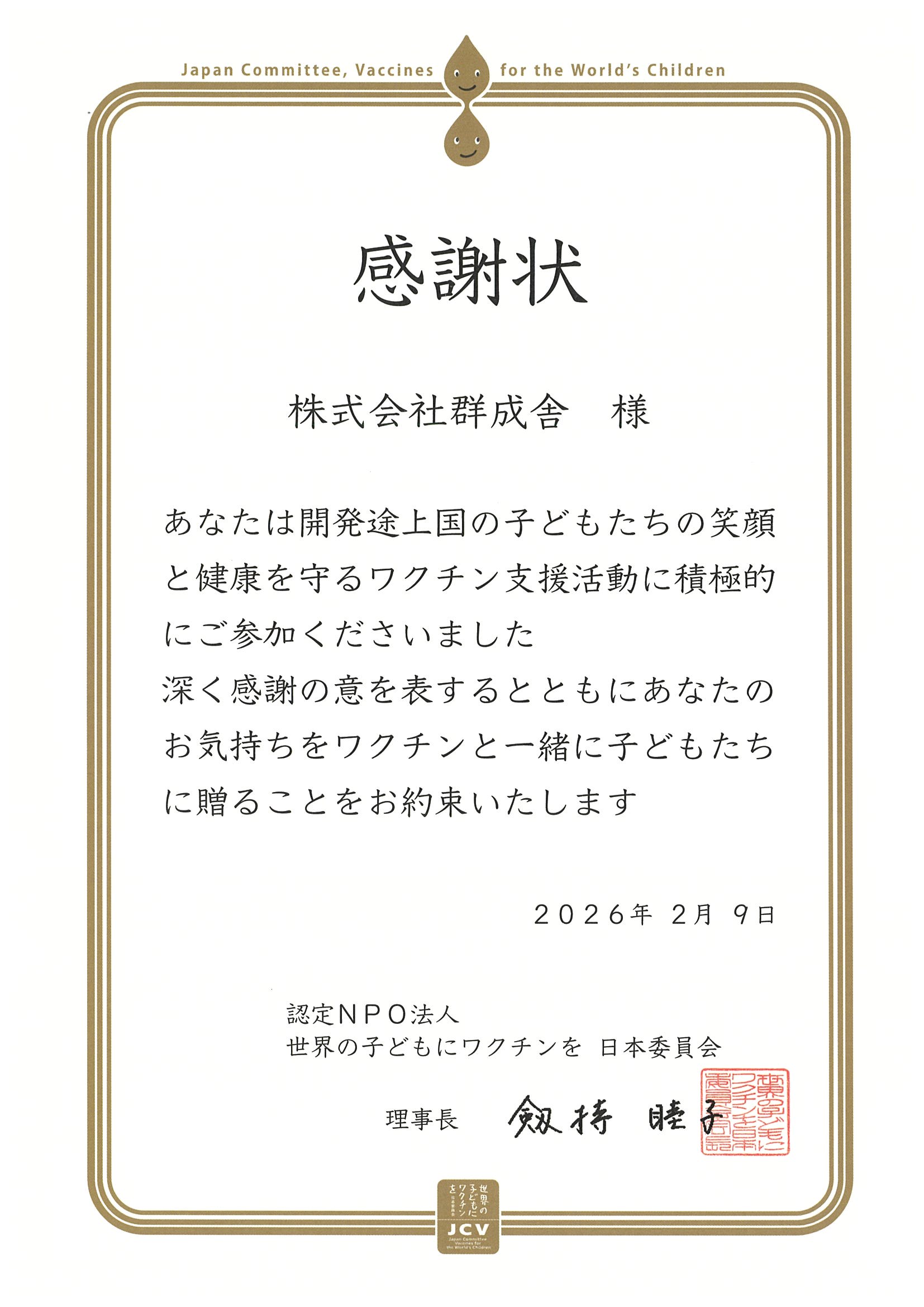又、売却代金は弊社から直接“世界の子どもにワクチンを 日本委員会(JCV)”へ寄付金として送金させて頂いており、発展途上国の子どもたちへ各種ワクチン接種等の支援に役立たせて頂いております。